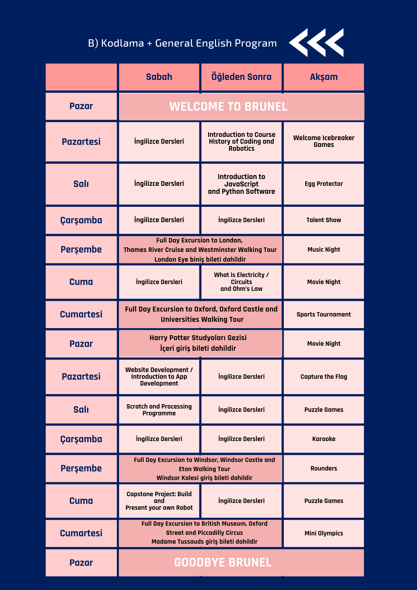 Haftada 2 tam gün ve 1 yarım gün gezi sunulmaktadır. Gezilerden bazıları; Londra, Cambridge, Oxford, Brighton, Windsor vb