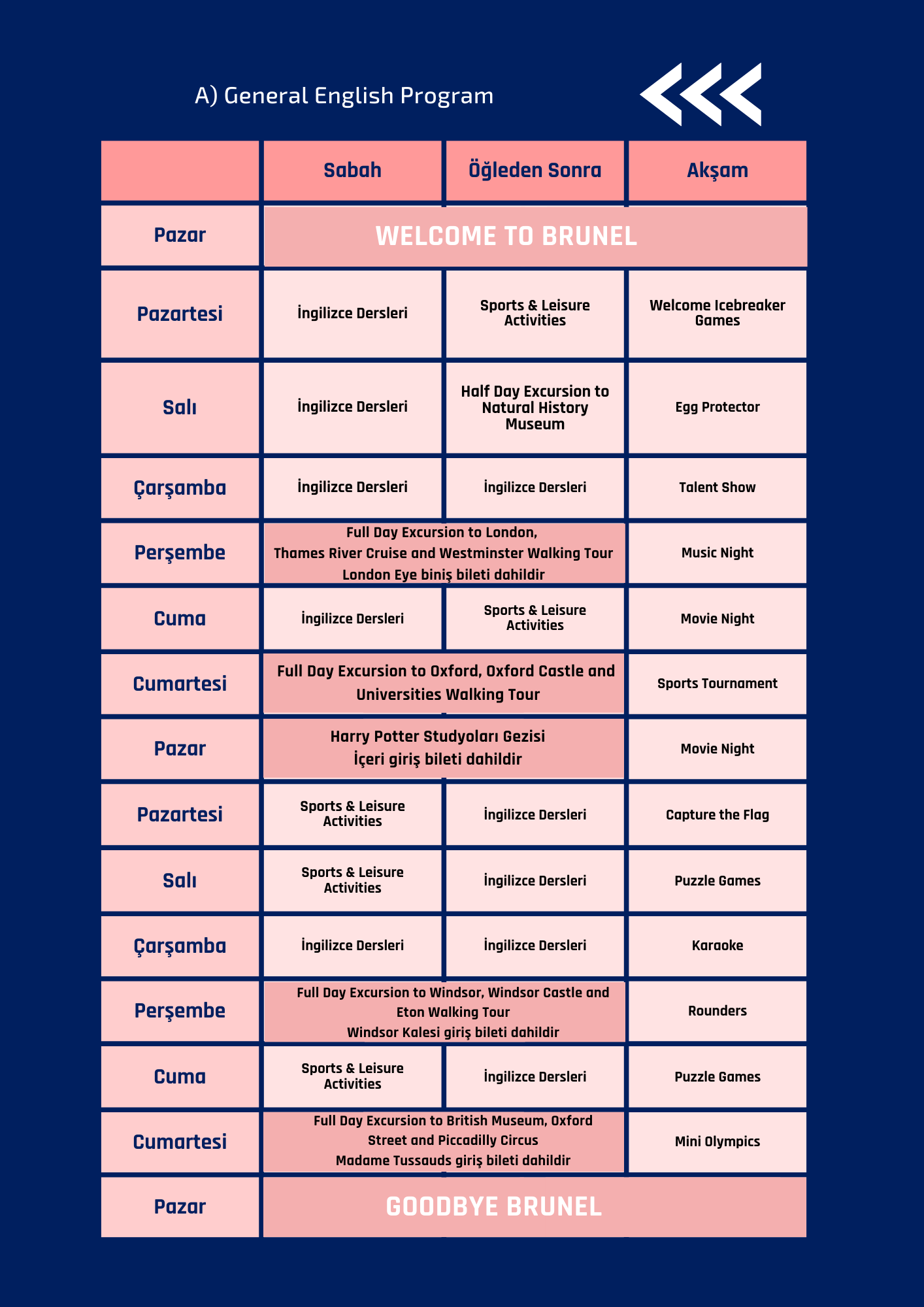 Haftada 2 tam gün ve 1 yarım gün gezi sunulmaktadır. Gezilerden bazıları; Londra, Cambridge, Oxford, Brighton, Windsor vb